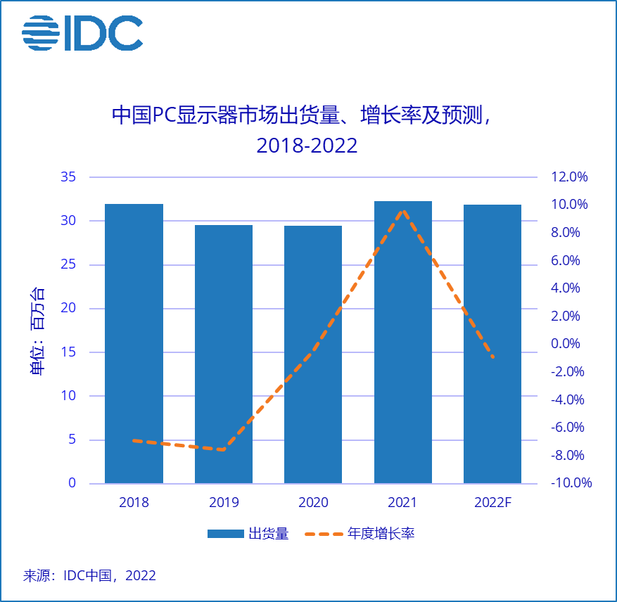 我国商场,跟着运用习气的培养,移动工作、长途学习场景对显现器的需求长期存在,可是现在需求高峰期已过,商场增加动力缺乏;疫情下地方政府、教育部门对工作设备的收购显着萎缩,终端需求下降,我国PC显现器商场应战加重。IDC估计,2022年我国PC显现器出货量缺乏3200万,同比下滑1.4%。