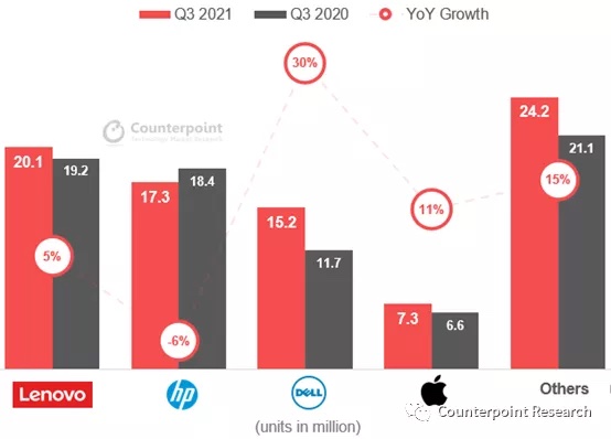 联想在三季度以23.9%的商场份额再次夺得榜首,出货量为2010万台,略高于本年二季度的数字。联想的首要优势是其运营的灵活性。惠普在三季度以20.5%的商场份额位列第二。因为Chromebook的出售放缓以及零部件供给缺少的影响,惠普在三季度出货量环比下降6%。戴尔在三季度环比添加30%,戴尔的高添加首要是因为上一年基数相对较低,而且戴尔在三季度要点放在商业/高端产品。苹果公司在2021年第三季度的出货量同比添加11%,首要是因为M1 芯片带来的换机需求。华硕在三季度打败了宏碁,位列全球第五。华硕的出货量的添加遭到消费类产品和商用产品的推进。而宏碁则因为Chromebook的放缓的影响,仅录得3%的同比添加。