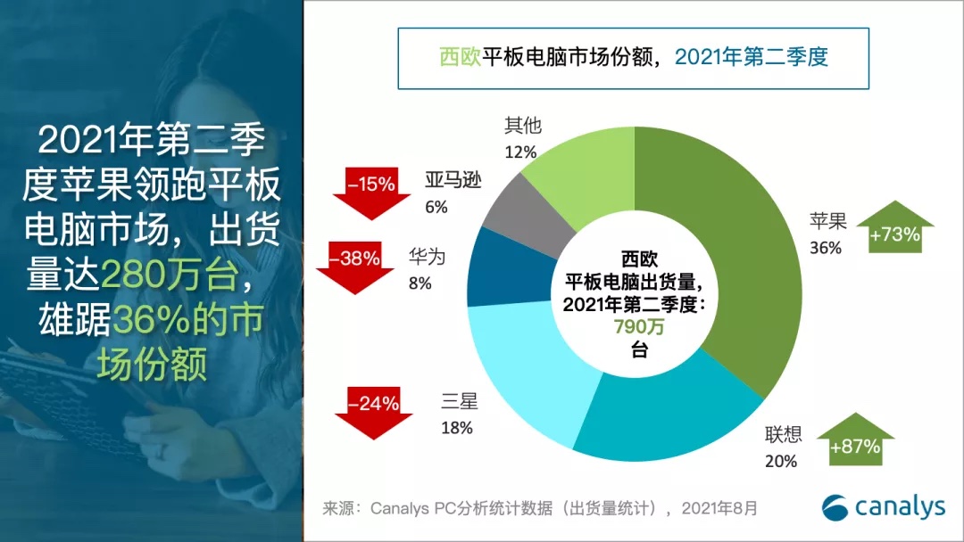 西欧商场的平板电脑出货量增加了 18%,出货量为 790 万台。Pham 说:“平板电脑不再仅仅一种文娱设备,而是俨然成了较廉价的PC替代品,用于长途工作和学习,在需求简略的学生傍边特别备受欢迎。”西欧商场的平板电脑范畴长期以来一向由苹果主导,2021 年第二季度该厂商的出货量激增73%。苹果最近发布的搭载 M1的 iPad Pro在西欧商场遭到热烈欢迎。联想位居第二,出货量年度增加率高达 87%。联想敏捷抓住了平板电脑需求旺盛的局势,当令推出了包含较廉价机型在内的很多产品,填补了苹果因更贵重的iPad留下的空白。但是,排名前五的其他厂商:三星、华为和亚马逊都遭受出货量下降的颓势。